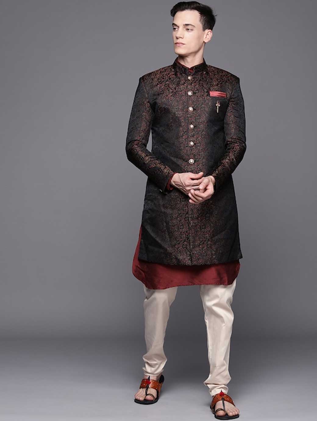 Men Maroon & Brown Ethnic Motifs Sherwani Maroon solid kurta, has a mandarin collar, long sleeves, side slits and 2 pockets Brown ethnic motifs woven design jacket, has a band collar, long sleeves and side slits Cream-coloured solid pyjama, has an elasticated waistband with drawstring closure and 2 pockets