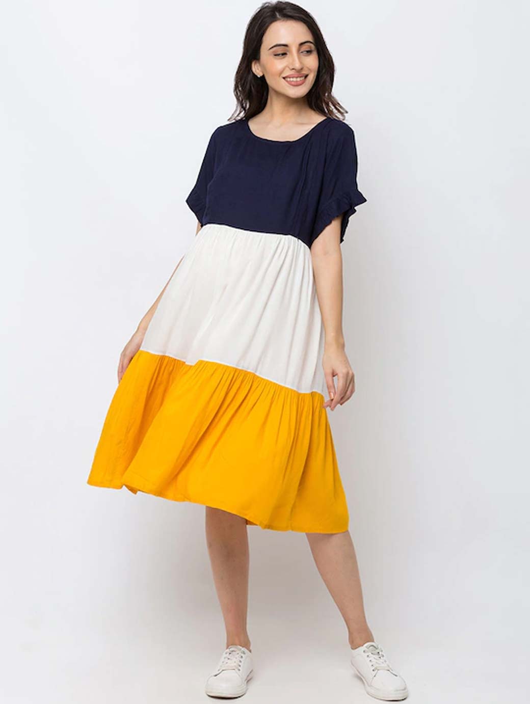 Navy Blue and White colourblocked knitted Nursing fit and flare dress, has a round neck, short sleeves, concealed zip closure, and flared hem