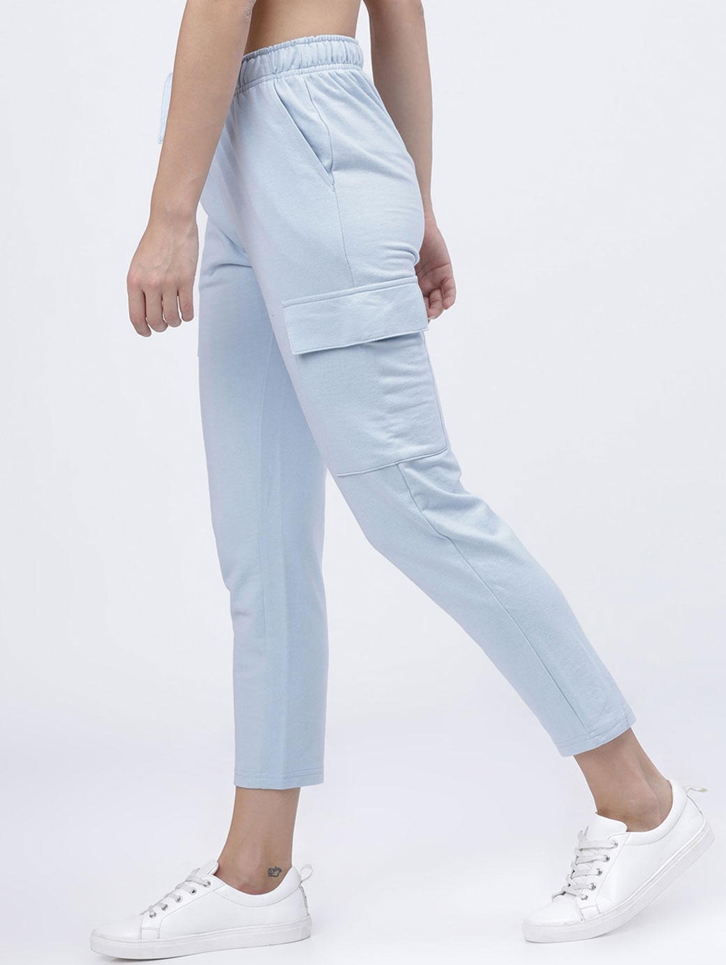 Blue solid slim-fit casual cargo track pants, has an elasticated waistband with a drawstring fastening, two side pockets and two flap pockets