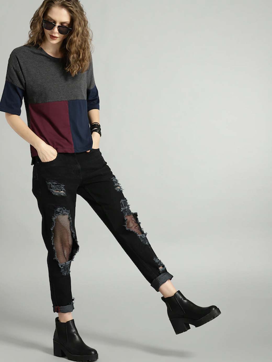 Charcoal, maroon and navy blue colourblocked T-shirt, has a round neck, short sleeves