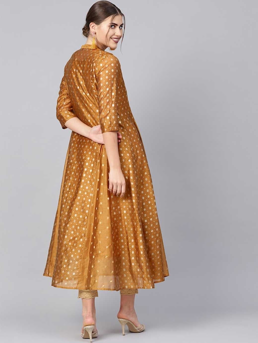 Mustard brown solid A-Line kurta, has a round neck, sleeveless, flared hem Comes with a mustard brown and golden printed anarkali kurta with panelled detail, has a mandarin collar, three-quarter sleeves, and flared hem