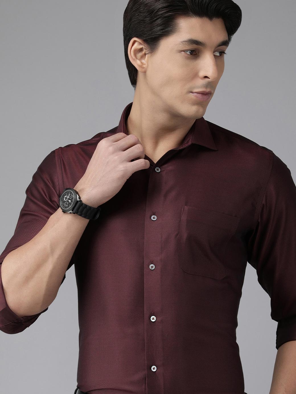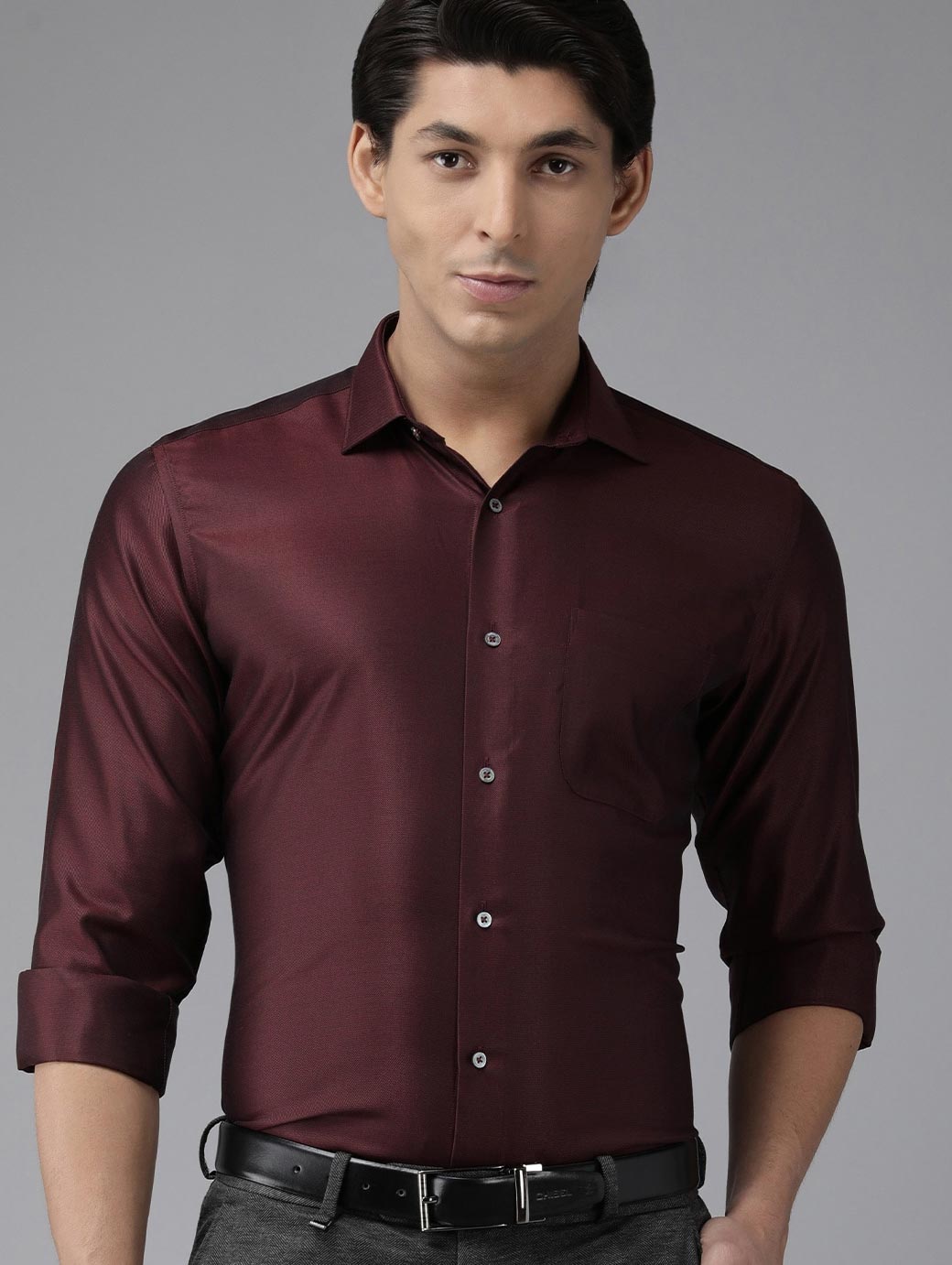 Burgundy self design formal shirt ,has a spread collar, button placket, 1 patch pocket, long roll-up sleeves, curved hem