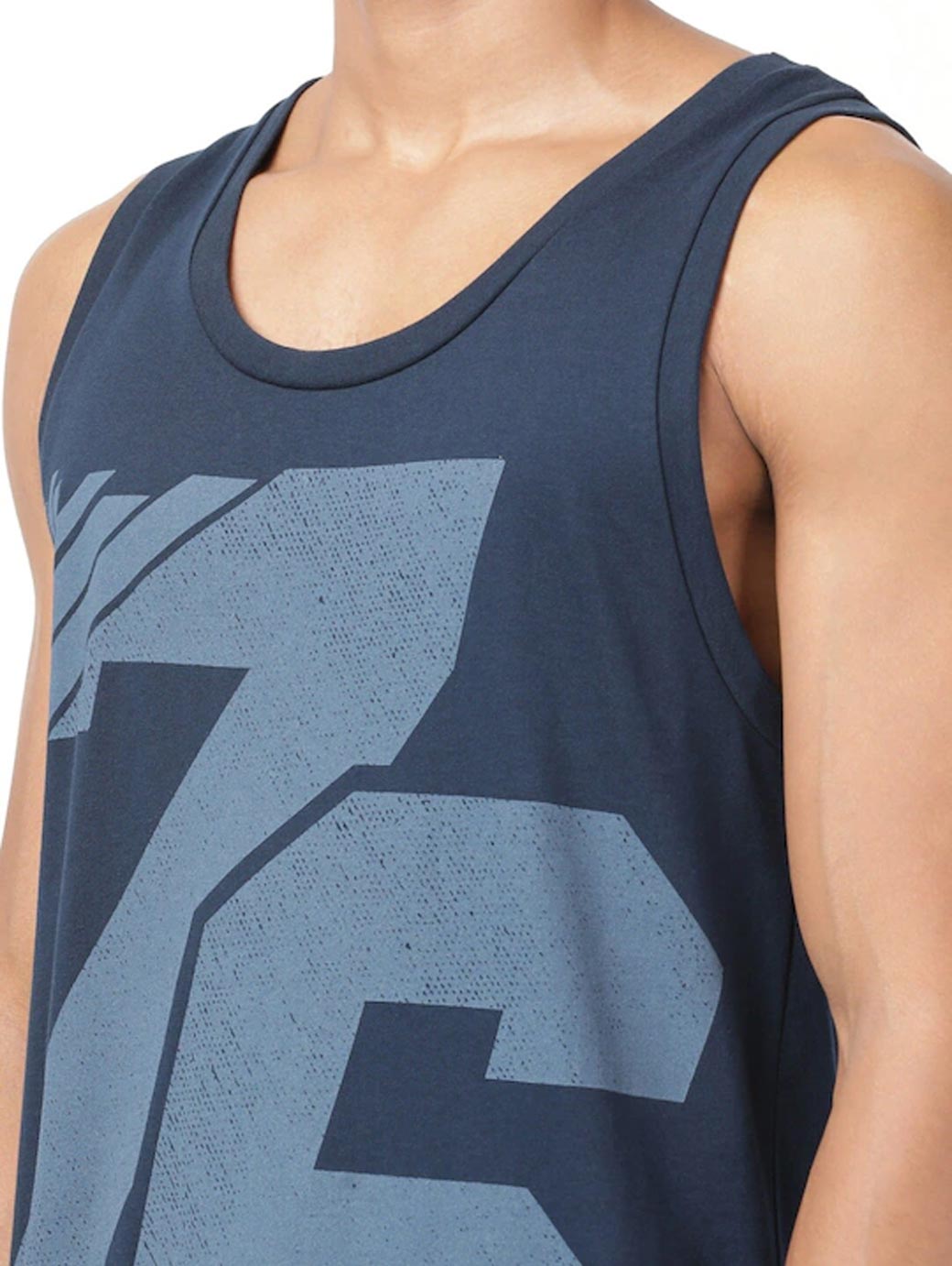 Navy Blue Printed innerwear gym vests, has a round neck and sleeveless