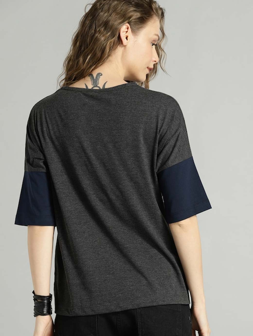 Charcoal, maroon and navy blue colourblocked T-shirt, has a round neck, short sleeves